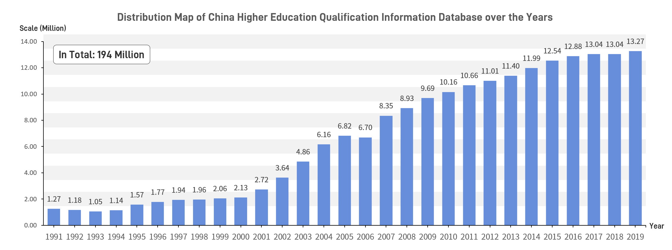 As of December 31, 2019, there were 13.27 million qualifications registered in 2019, including 8.4 million for regular higher education (0.65 million for postgraduates, 7.75 million for regular undergraduate and junior college), 4.87 million for continuing education (2.16 million for adult undergraduate and junior college, 1.58 million for online education, 0.89 million for open education and 0.24 million for Examinations for Self-taught People).