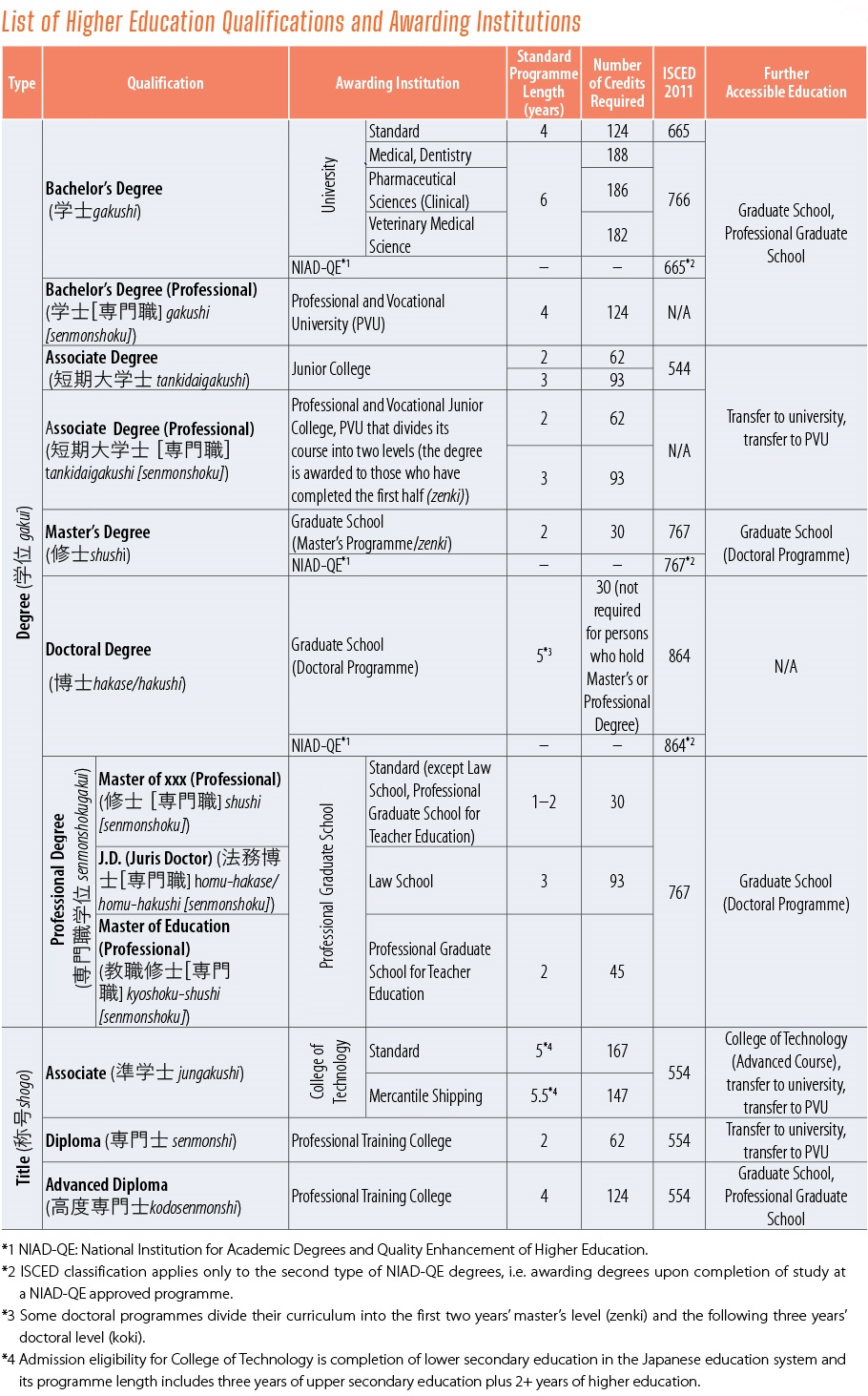 In addition to higher education institutions explained in the Higher Education section, the National Institution for Academic Degrees and Quality Enhancement of Higher Education (NIAD-QE) can award bachelor’s, master’s, and doctoral degrees based on the Degree Regulations (Ordinance of the Ministry of Education, Science and Culture No.9 of 1953).